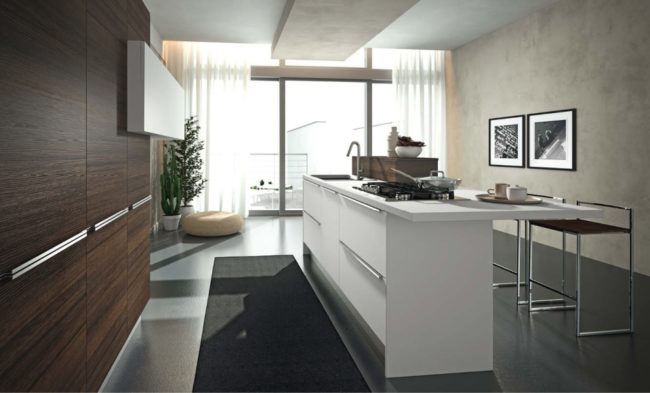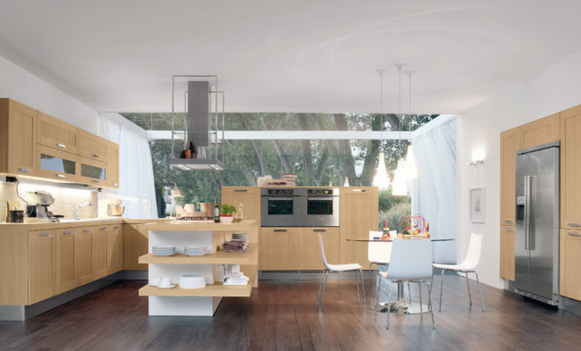 Une cuisine design agréable au toucher avec porte lambrissée en bois