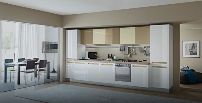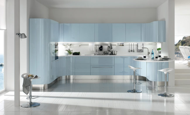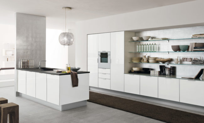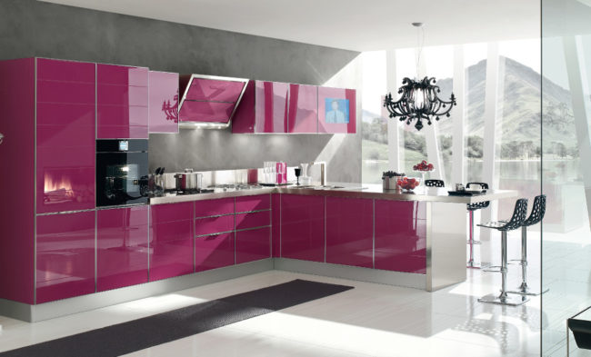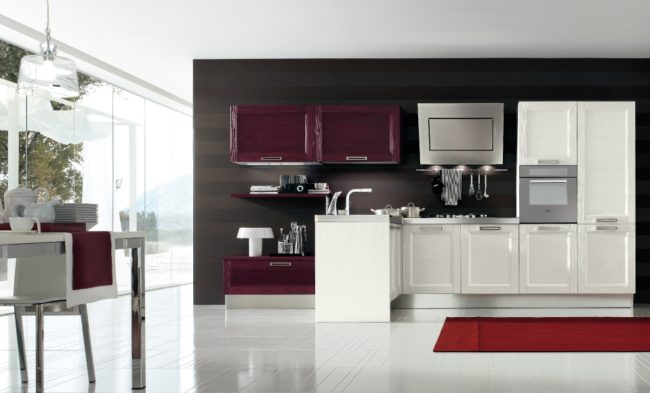 le rouge bordeaux brillant associé à des meubles hauts en verre blanc