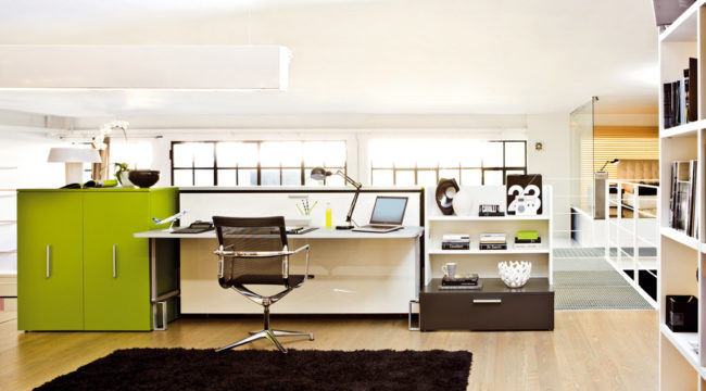 Système transformable avec lit à 2 places rabattable verticalement toujours prêt..