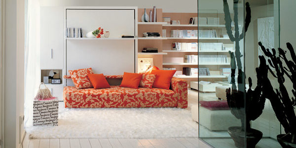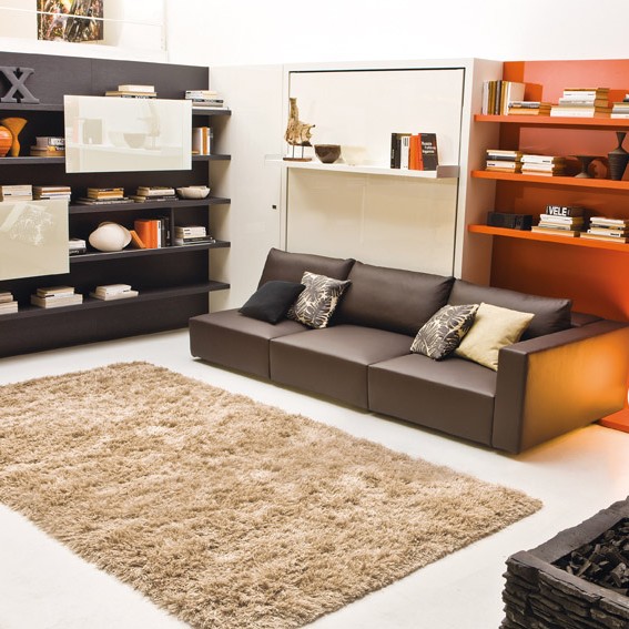 Canapé de 245 cm de largeur avec coffre rangement sous l’assise et intégré à une paroi modulaire living, il se transforme pour la nuit en lit à 2 places toujours prêt avec sommier à lattes novateur avec encadrement en aluminium