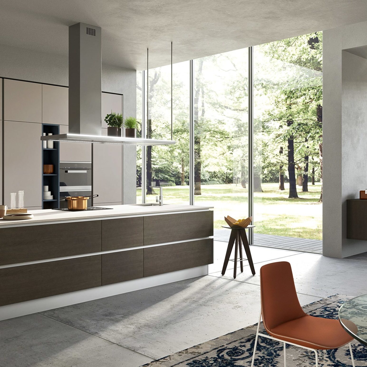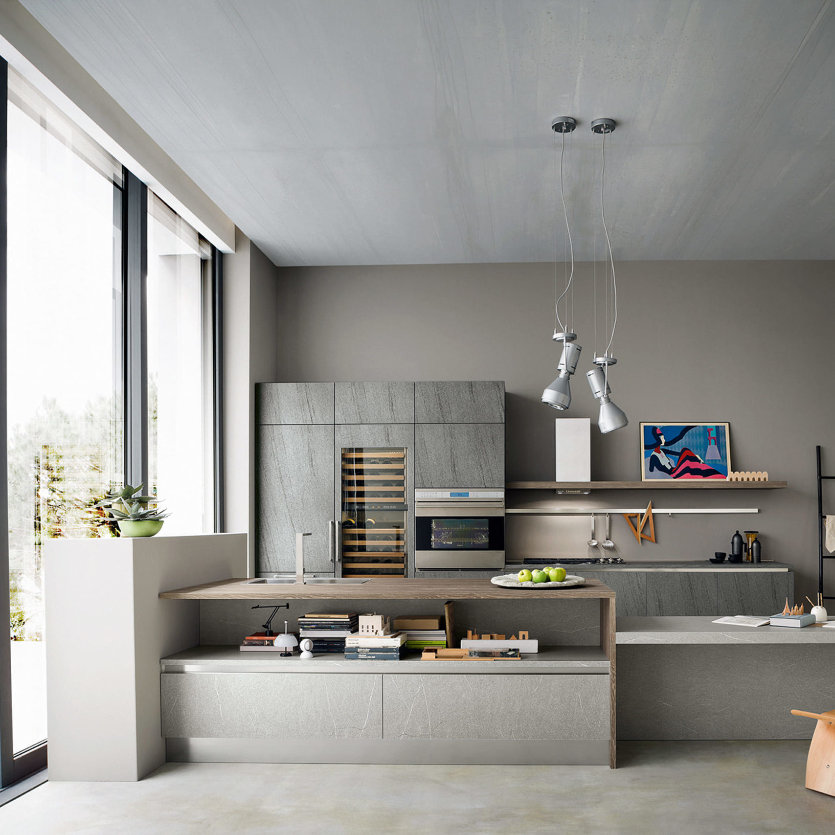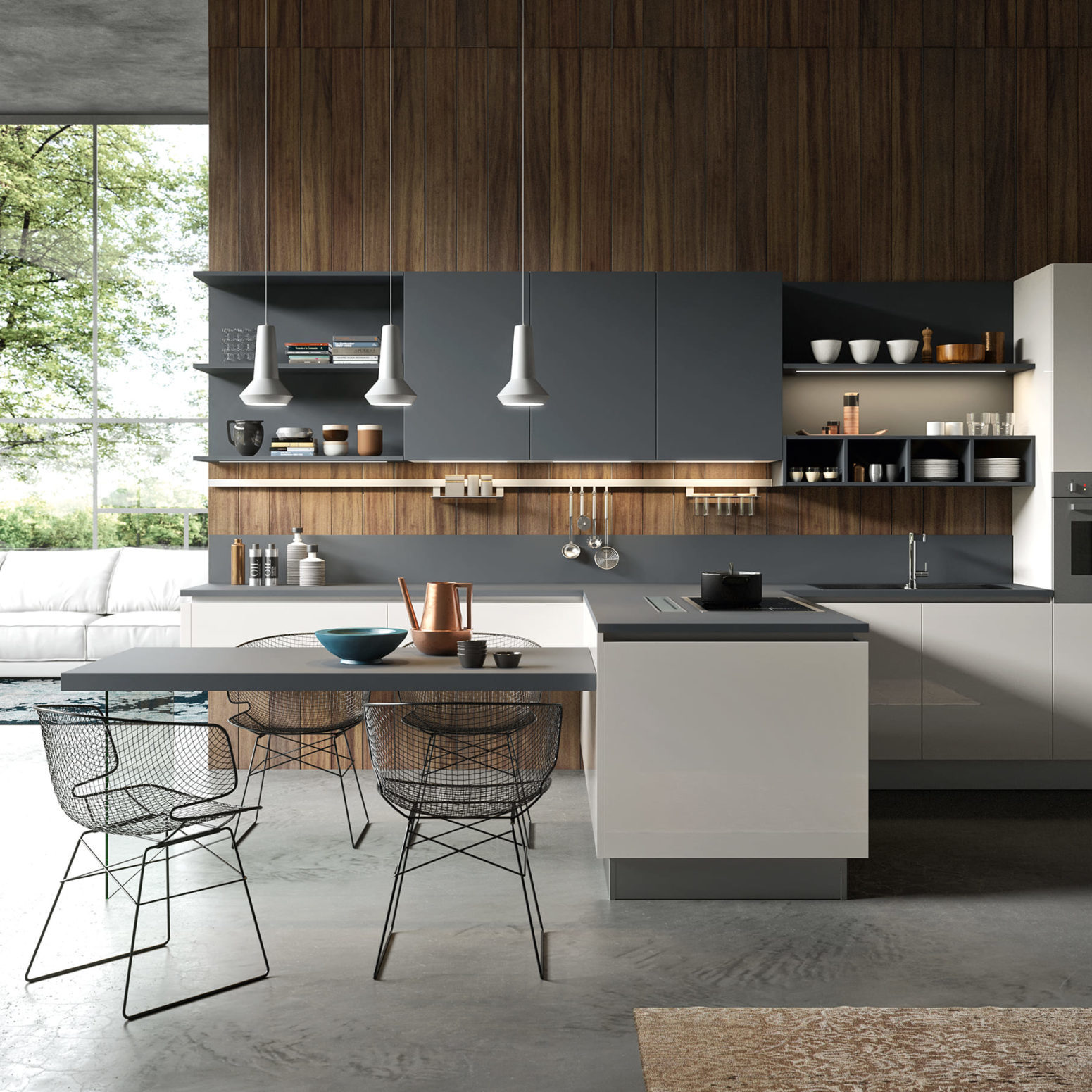 Accessoires, ustensiles, condiments et épices… tout est à portée de main, utilisé et remis à sa place. Ainsi le plan de travail est toujours libre, propre et en ordre. Grâce aux capteurs, les meubles hauts en métal descendent du plafond entre les profils de fixation.