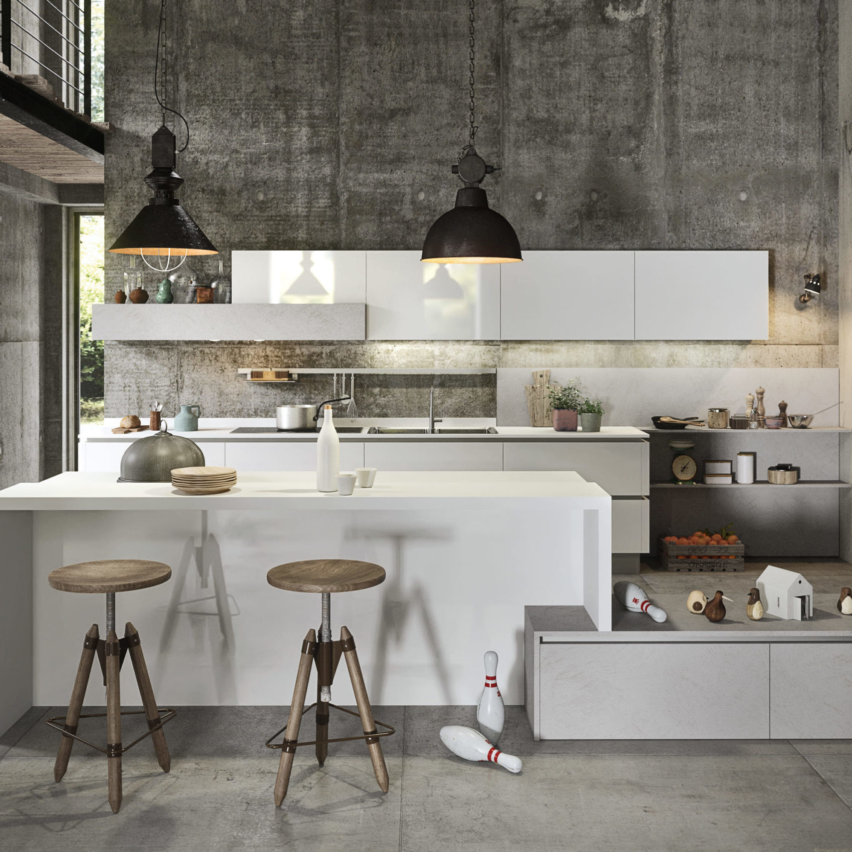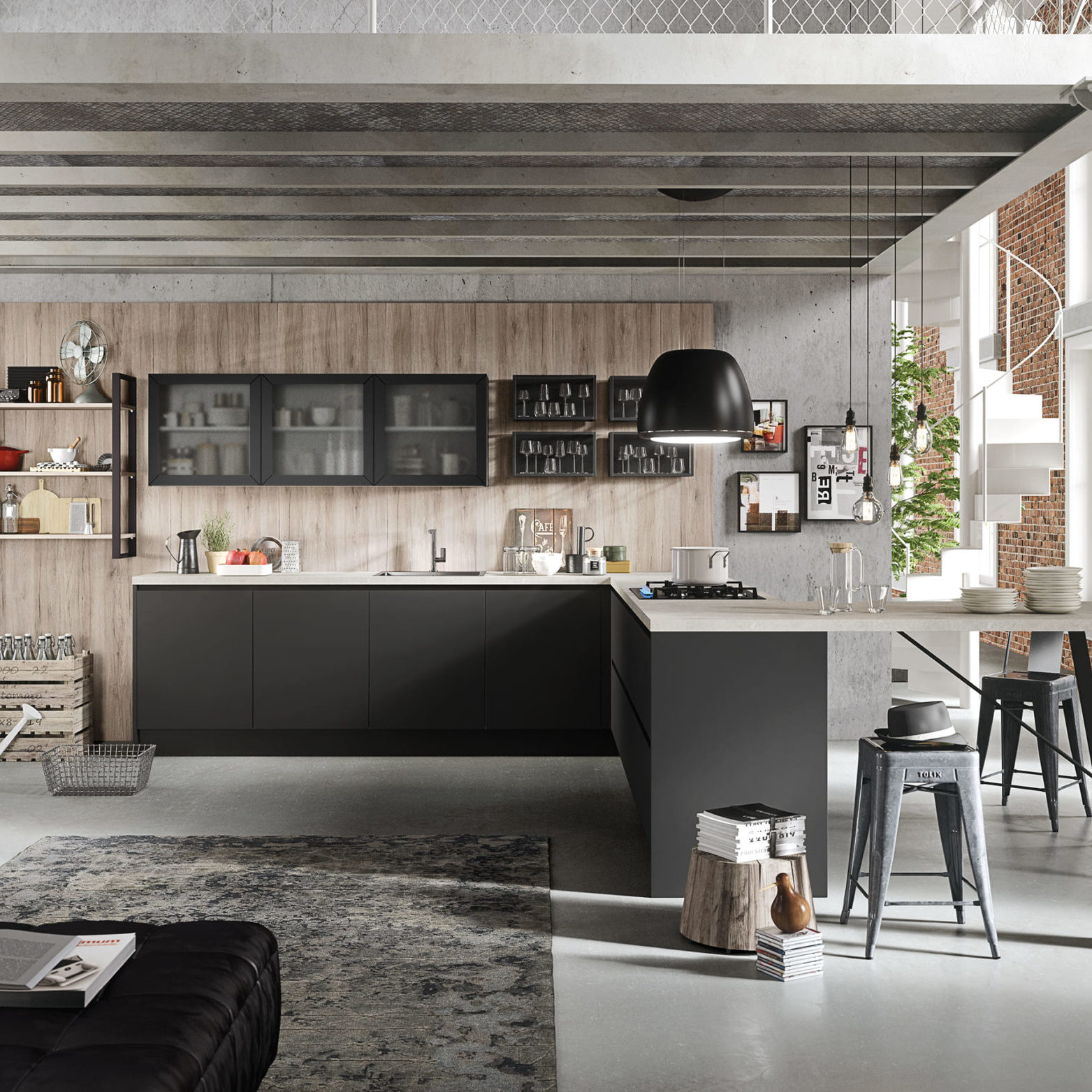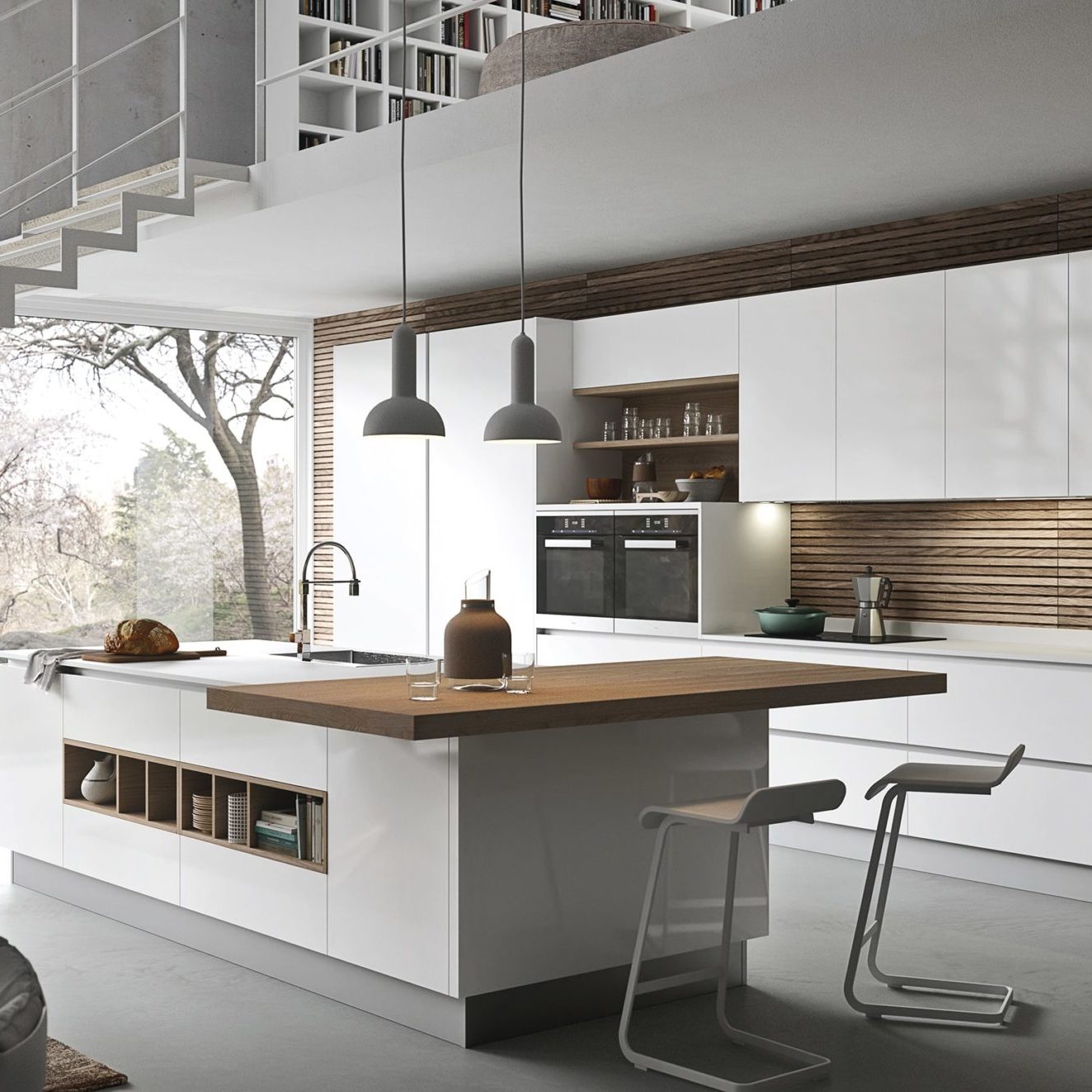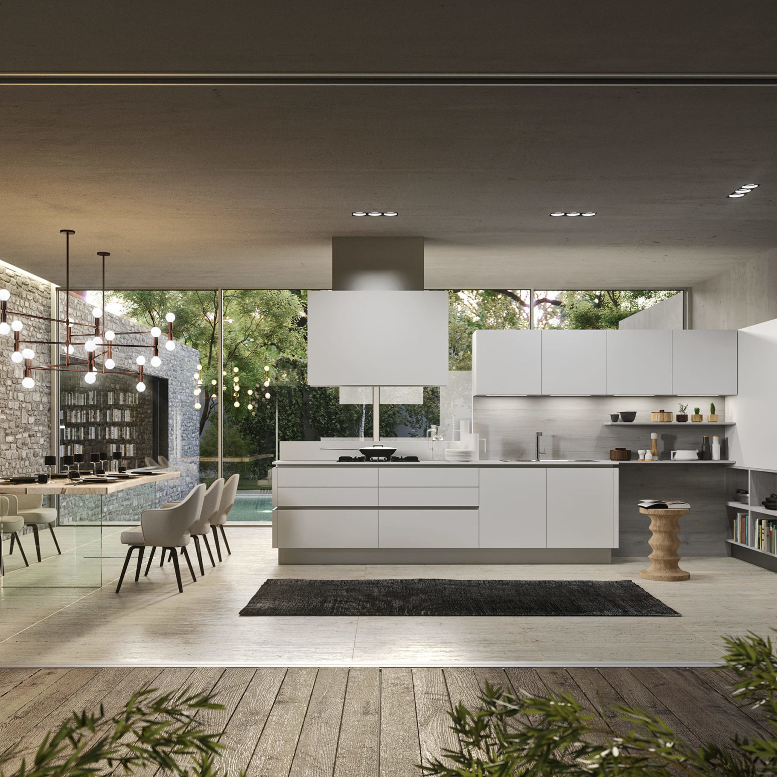 Accessoires, ustensiles, condiments et épices… tout est à portée de main, utilisé et remis à sa place. Ainsi le plan de travail est toujours libre, propre et en ordre. Grâce aux capteurs, les meubles hauts en métal descendent du plafond entre les profils de fixation.