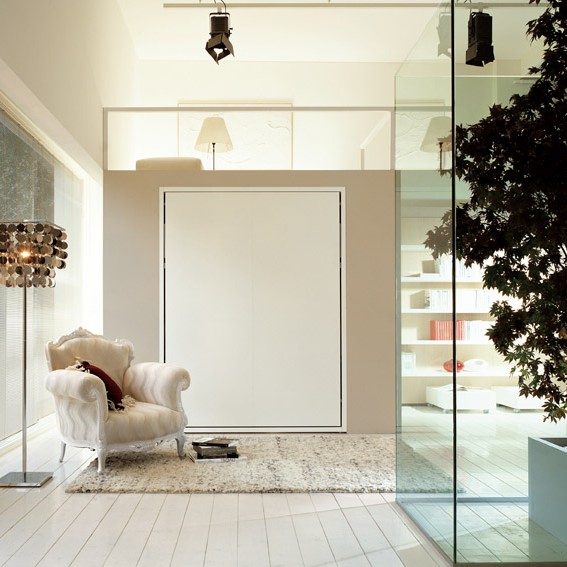 Système transformable avec lit à 2 places rabattable verticalement avec sommier à lattes novateur avec encadrement en aluminium..