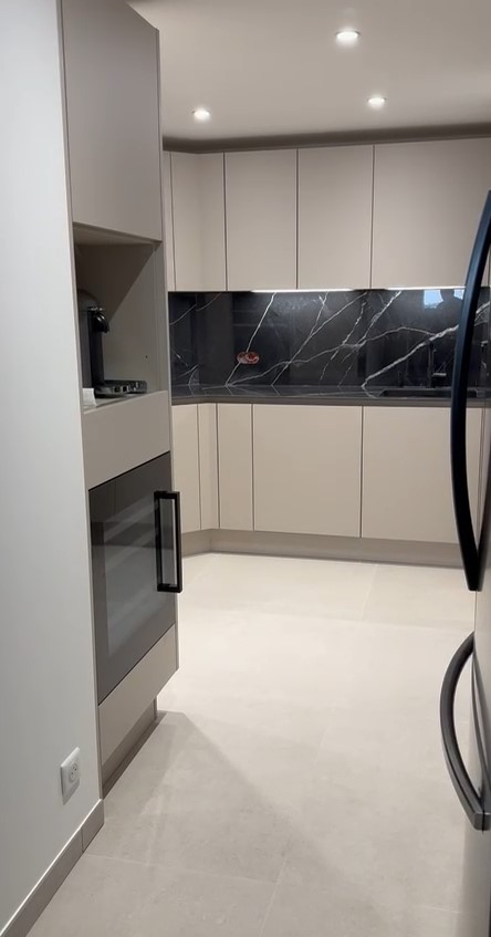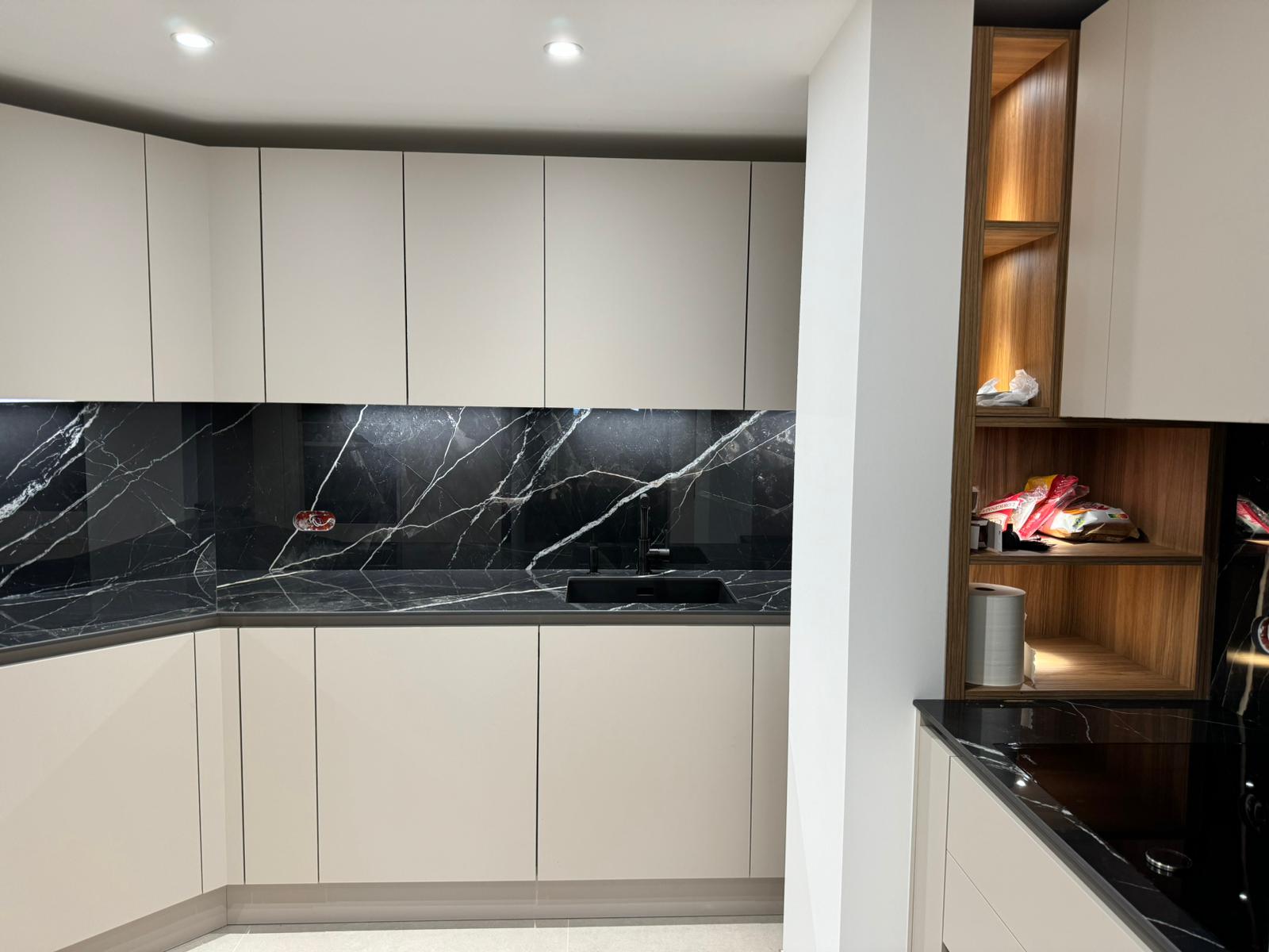 - L’Intemporalité du Beige & Noir : Les façades d’un beige sable mat apportent une douceur lumineuse qui vient contraster avec la profondeur dramatique du marbre noir veiné de blanc. Ce duo chromatique offre une esthétique à la fois chic et apaisante.