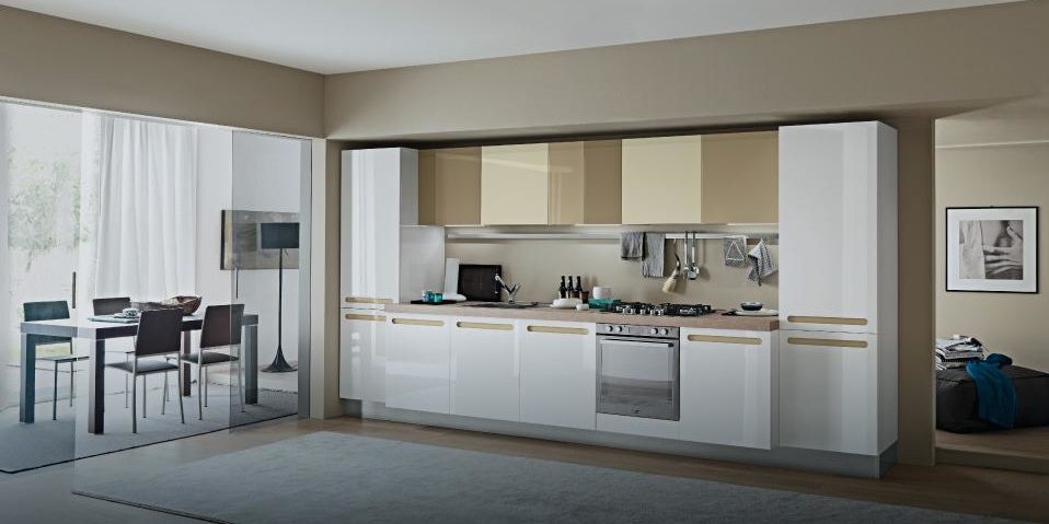 La caractéristique de la cuisine Miami en blanc laqué brillant est la poignée horizontale encastrée disponible