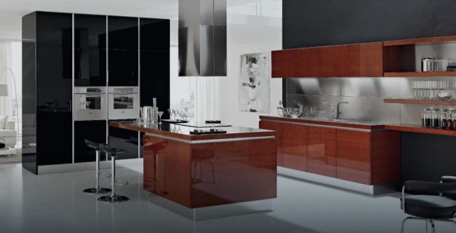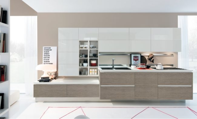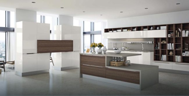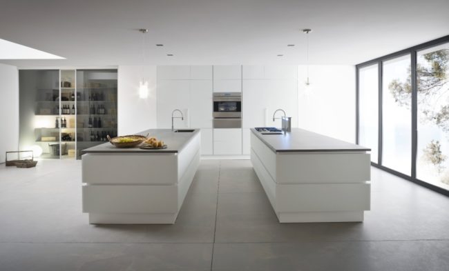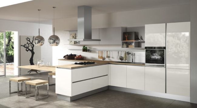 Verre blanc brillant et cuir de cendres pour la cuisine aux lignes épurées.