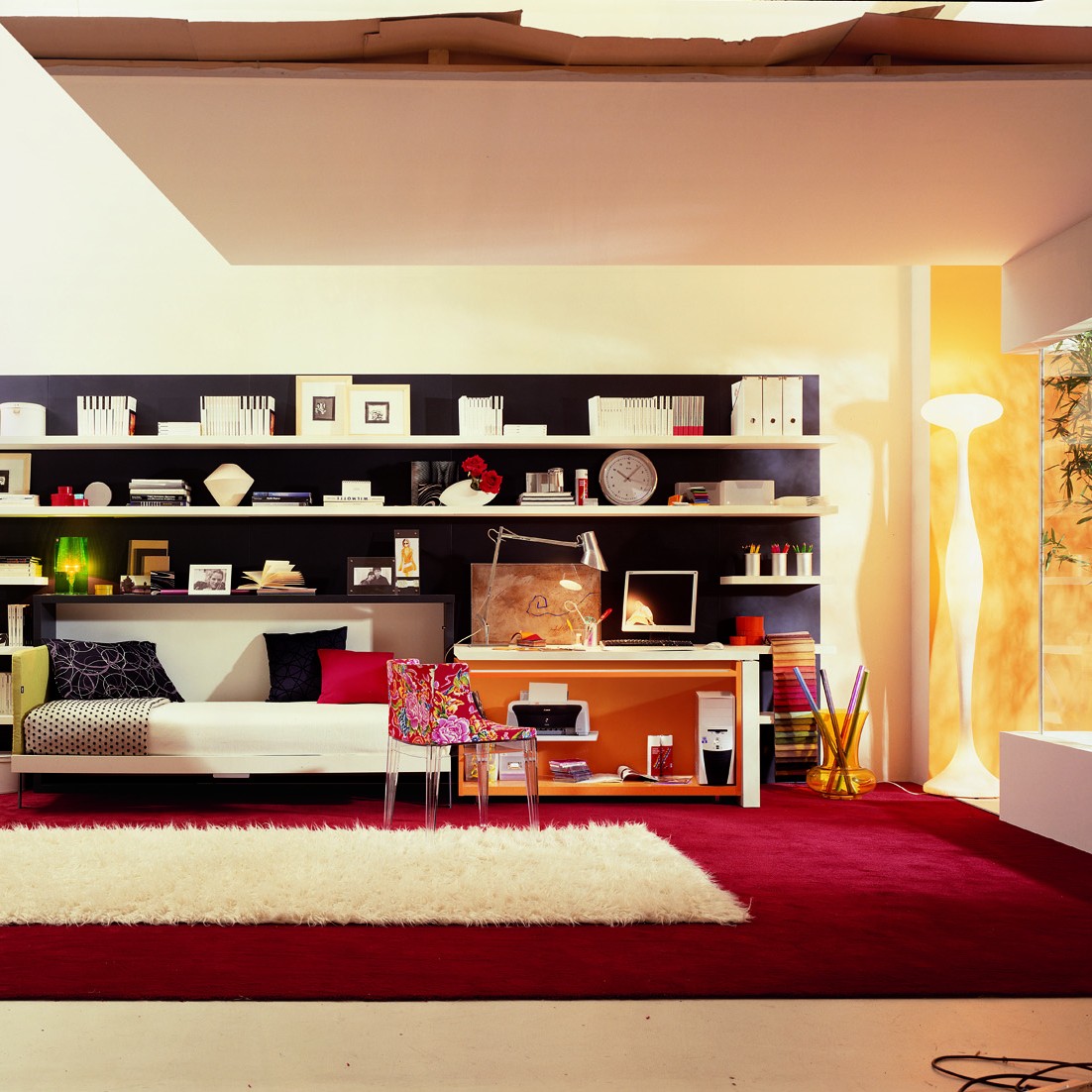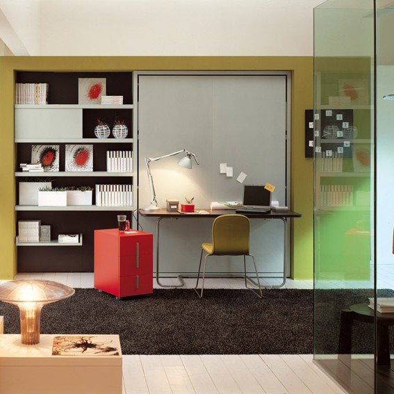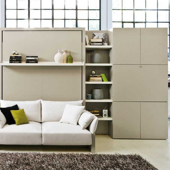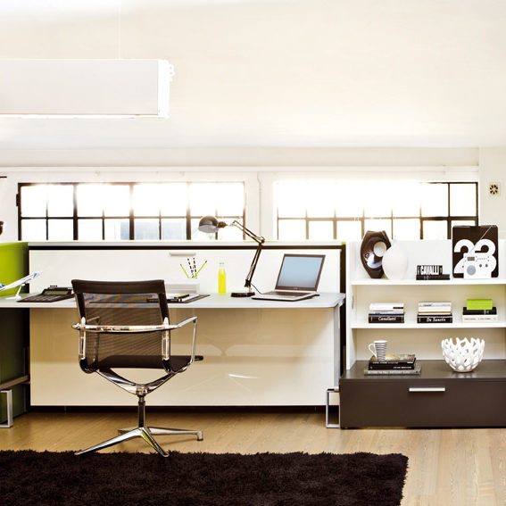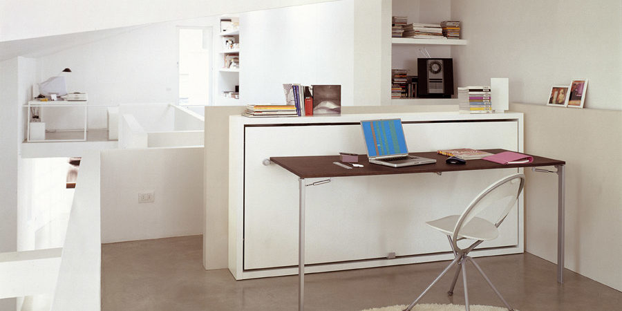 Système transformable composé d’un lit rabattable toujours prêt avec sommier à lattes et d’une table abattante. Ce modèle est disponible avec lit à 1 place (Poppi 90) ou 1 place et demie (Poppi 120), même sans table.